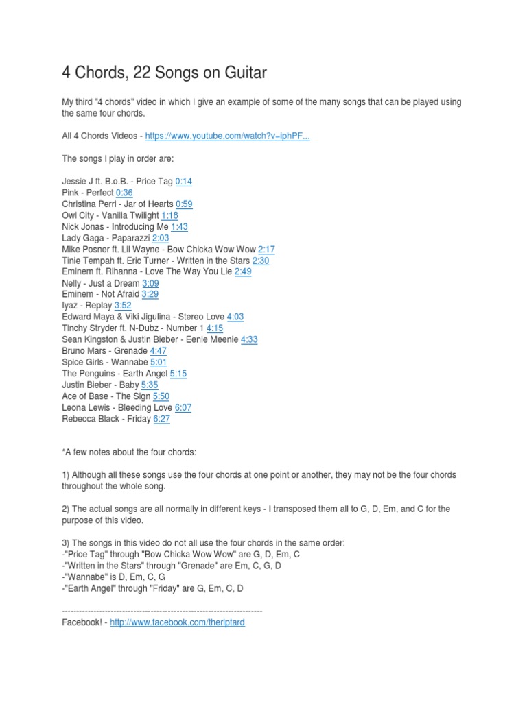 Up to 4 chord guitar songs. Australian comedy group 'axis of awesome' perform a sketch from the 2009 melbourne international comedy festival. View this video on youtube. View category one of the best things about learning to play guitar is you can learn just a few chords and then be able to play hundreds of the best songs that were ever written. And you know what, this is just the tip of the iceberg.